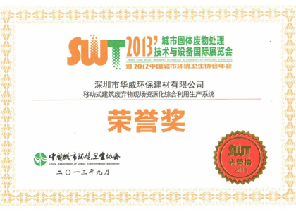 城市固體廢物處理技術(shù)與設(shè)備國(guó)際展覽會(huì)榮譽(yù)獎(jiǎng)